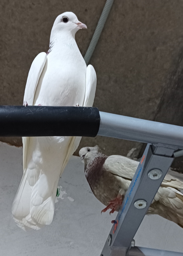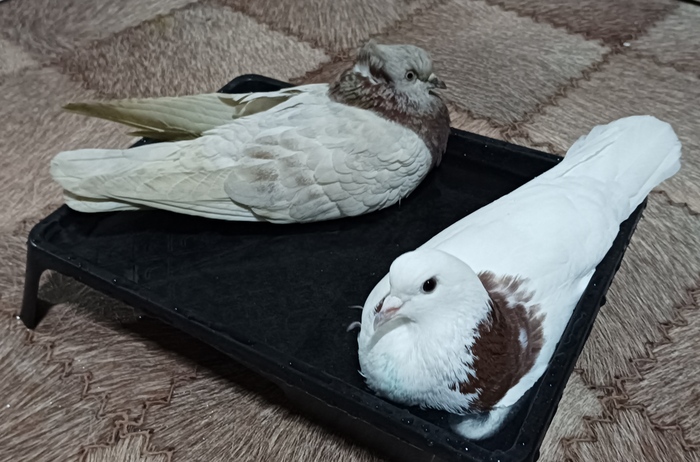 Первая голубка (из этого поста) поправилась и уехала в голубятню. А до этого у меня оказалась другая, истощённая, со сломанной лапой и полной коллекцией голубиных блох. Первое время была лежачей. Сейчас конечность работает, отъедается и, как видите, выглядит вполне представительно. Но из-за отсутствия оперения на сломанной лапе останется у меня до теплых дней. Пока она жила вместе со старой птичкой, они были подружками.