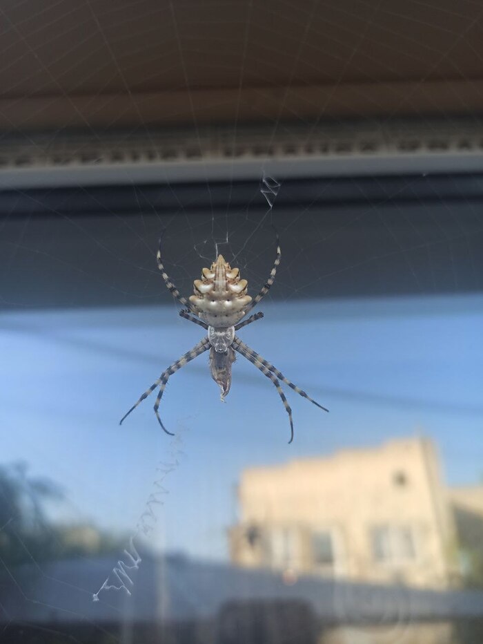 Паук не опасен, пишут в интернете, потому живёт на окне и его домашние жители не гоняют, а наоборот заботятся.