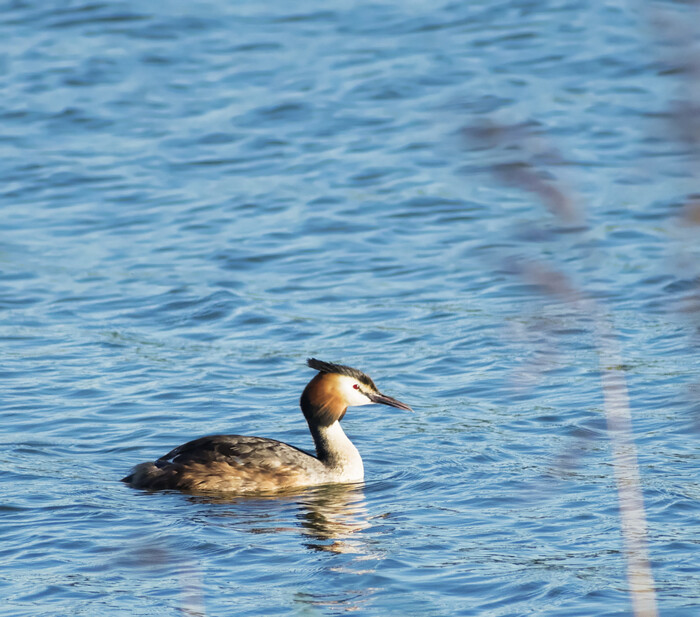 Родители периодически оставляют птенца одного, когда ловят рыбу. Один родитель уплывает совсем далеко, а второй всё-таки косит одним глазом на дитяту. Но мелкий всё время дрейфовал вплотную к берегу, где из-за высокой травы фотографировать не удобно.