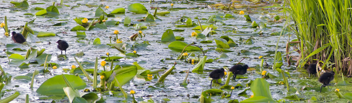 А возле самого конца маршрута своих малышей решила показать камышница. Мама оказалось плодовитой и птенцов было много. Штук 8-10.