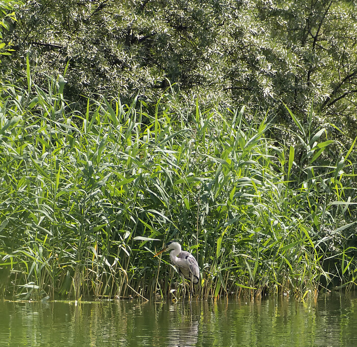 А потом пожаловала серая цапля. Пролетев мимо меня, она устроилась в камышах ловить рыбу. Раза два кажись кого-то поймала.