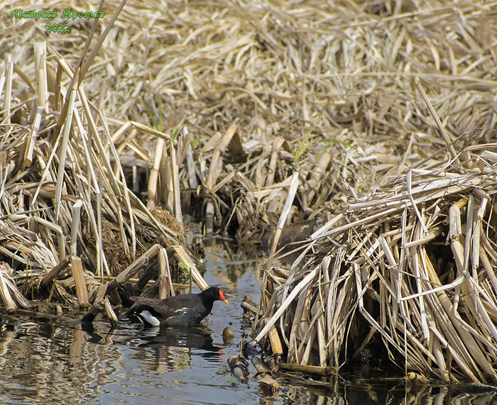 Неделю назад, уже в потёмках, краем глаза удалось заметить одну птаху. Фотографировать уже было никак из-за темноты. Но по характерным движениям я понял, что предо мной камышница или водяная курица. А сегодня получилось и сфотографировать одну из двух.