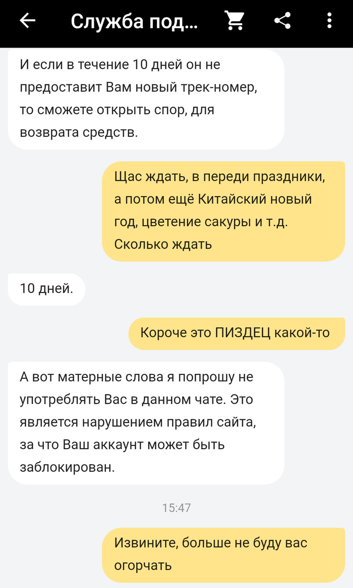 Добрый день уважаемые пикабушники, 26.10.2019 заказал на одном из известных сайтов себе товар, четыре дня ни слуху ни духа от продавца. Вчера написал в службу поддержки, и тут "О ЧУДО" товар сразу был отправлен, но сегодня пришло письмо от продавца.