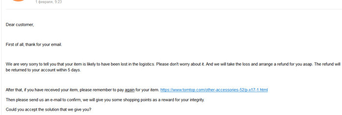 На следующий день ни предложили мне те же самые варианты но уже на русском.Еще через три дня обещали связаться с отделом логистики и отправить мне как можно скорее. Я написл что требую возврата. Ответ был гениален.