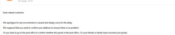 Результата ноль. Через еще месяц снова вспомнил про этих жуликов. написал еще раз. и о чудо! Мне ответили! Что же они ответили? Конечно же порекомендовали проверить адрес, а еще порекомендовали сходить на почту, ну и еще предположили что мои друзья или семья пошли и получили мою посылку.