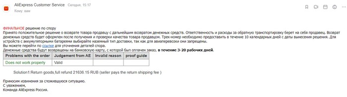 Заказал на Али гирлянду на елку. Пришла, пол часа проработала и вырубилась-больше не включается. Открываю диспут, записываю видео-публикую 12 декабря. Продавец отвечает что нужно использовать адаптер большей мощности. Записываю видео с адаптером большей мощности. Тут прикол. Как диспут открыт-видео в него больше не вставляется. Опубликовал на ютуб, кинул ссылку продавцу. Тот пишет ничего не знаю, ютуб открыть из китая не могу. Добавляю фотки 67w зарадника, ссылку на ютуб в диспут. Наступает 21 декабря, приходит такое вот решение по диспуту.