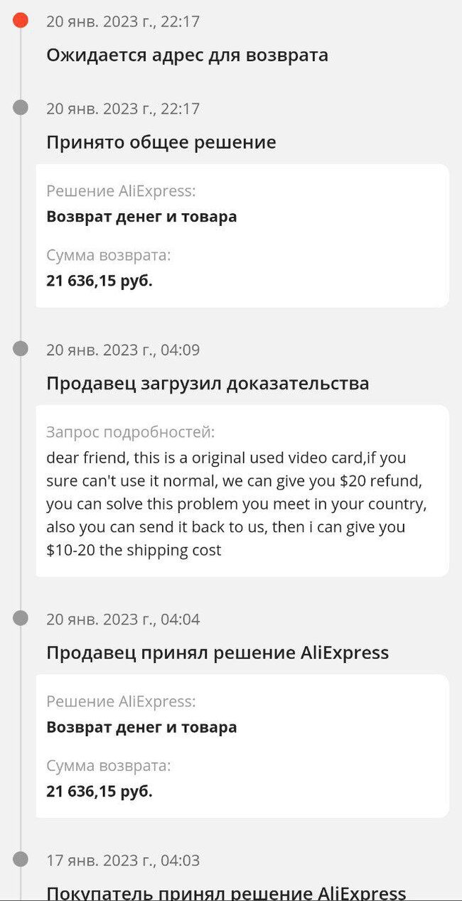 Подскажите пожалуйста, первый раз открыл спор на Али, прислали товар не той модели, еще и дешевле. Позиция выигрышная, но при ведении спора захотел добавить еще фото и нажал не ту кнопку, там невозможно понять ничего. Где исправить свое же предложение я так и не нашел. В результате вместо денежной компенсации, предложил и вернуть товар тоже. Продавец тут же согласился с этим идиотским предложением и закрыл спор. Служба поддержки - это бот с пятью вопросами и все.