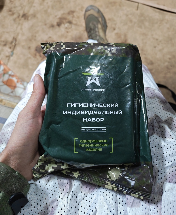 Смотрите: гигиенический индивидуальный набор. Кстати, сначала я к нему отнёсся скептически, но он оказался реально рабочим. Особенно в наших условиях, где с водой бывает туго.