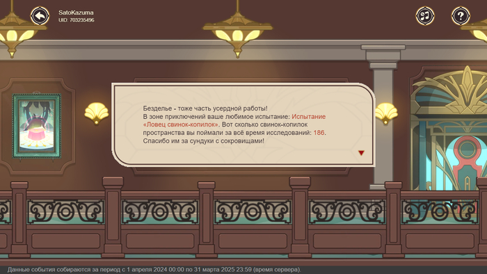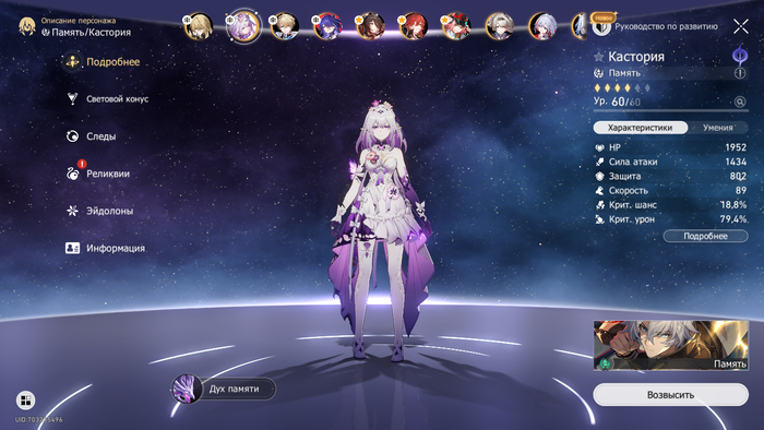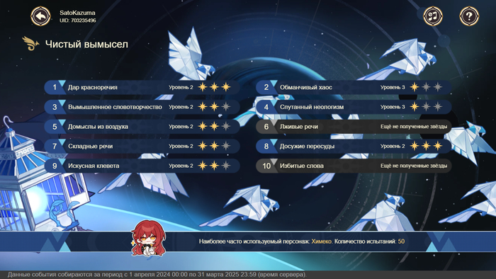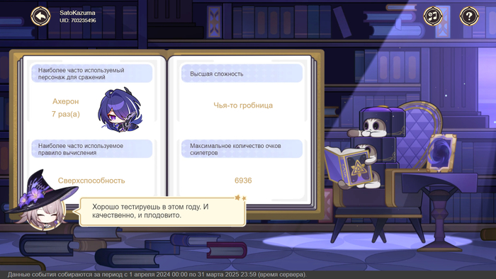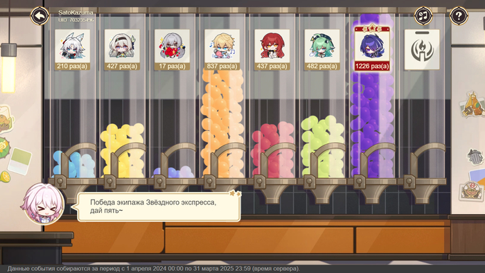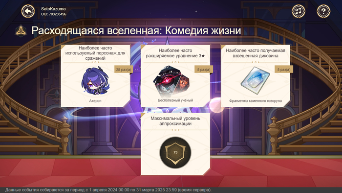 Артефакты ей выбить будет непросто, но у меня скоро отпуск и я буду тупо бить. Да билеты авто получения артефактов закончились, все пожрала Кафка, Химеко, Лебедь и другие товарищи