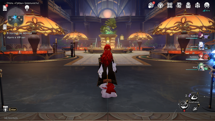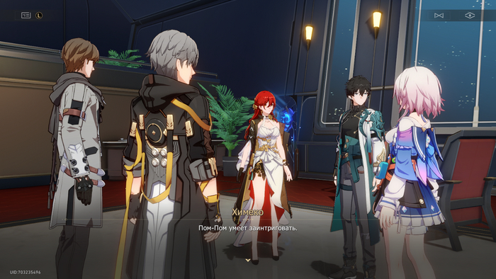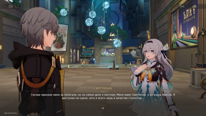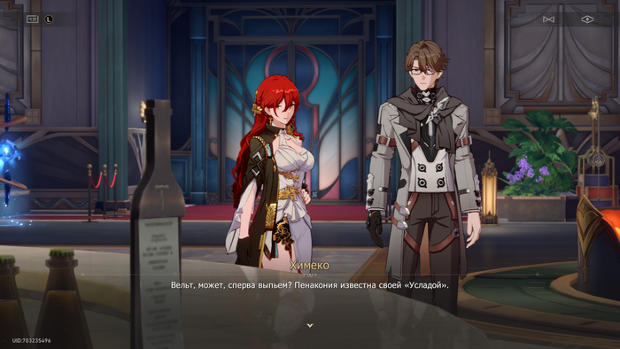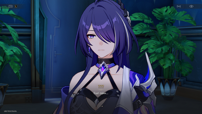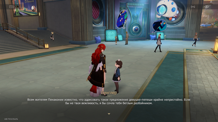 Её: иди за мной сюда, заставили меня злиться, но дальнейшие вопросы, что же, это напомнило дежавю с Кафкой где "можешь ответить правдой на один вопрос, а на остальные два соврать"(вроде так). А прощание с ней, что же в чём хороши Hoyoverse это в видеовставках