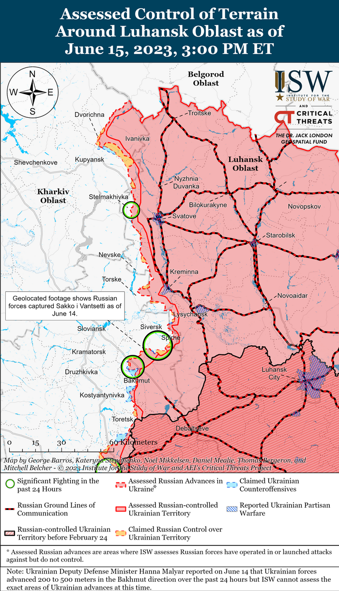 Украинские и российские войска провели наземные атаки в районе Бахмута, и по состоянию на 15 июня российские силы отвоевали территорию.