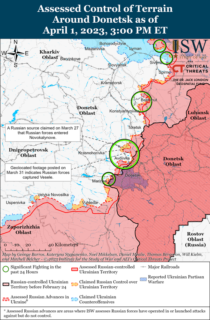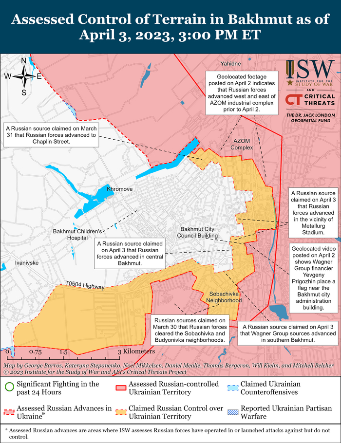 Российские силы продолжали наступательные операции в пределах Бахмута 4 апреля. Геолокационные кадры, опубликованные 3 апреля, показывают, что российские силы, вероятно, продвинулись на юге Бахмута ближе к стадиону «Авангард».[27] 4 апреля российские блогеры заявили, что силы Вагнера захватили железнодорожную станцию Бахмут-1, хотя визуальных подтверждений этому утверждению ISW не наблюдал[28].