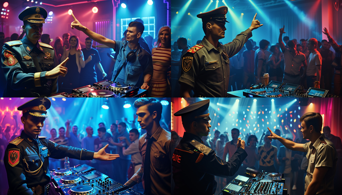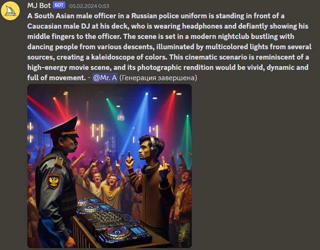 Теперь история. По стандартному простому промпту, в котором диджей показывает средние пальцы мужчине в форме полицейского миджорни выдавала примерно следующее: