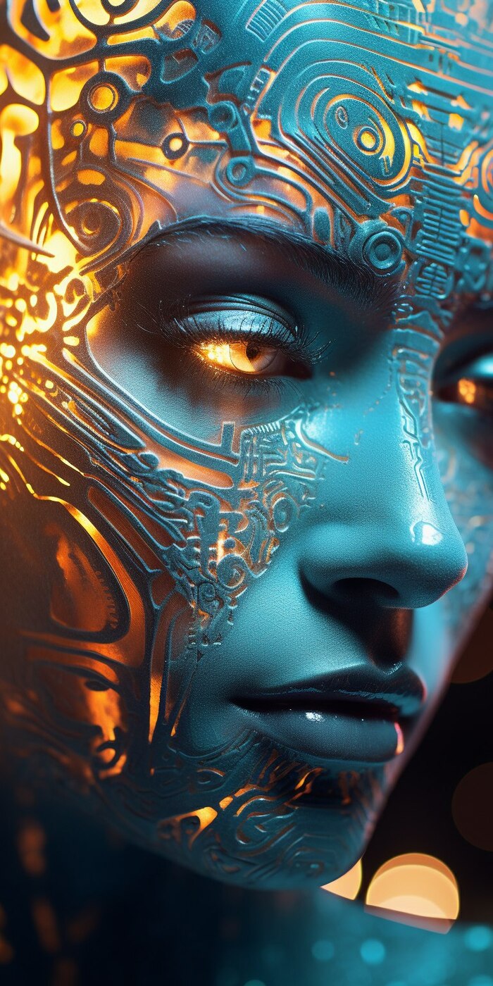 half human half alien face, intricate detailed, glowing, circuit lines patterns, gummy molten metal, bokeh render, gentle aurora vibrations --ar 1:2