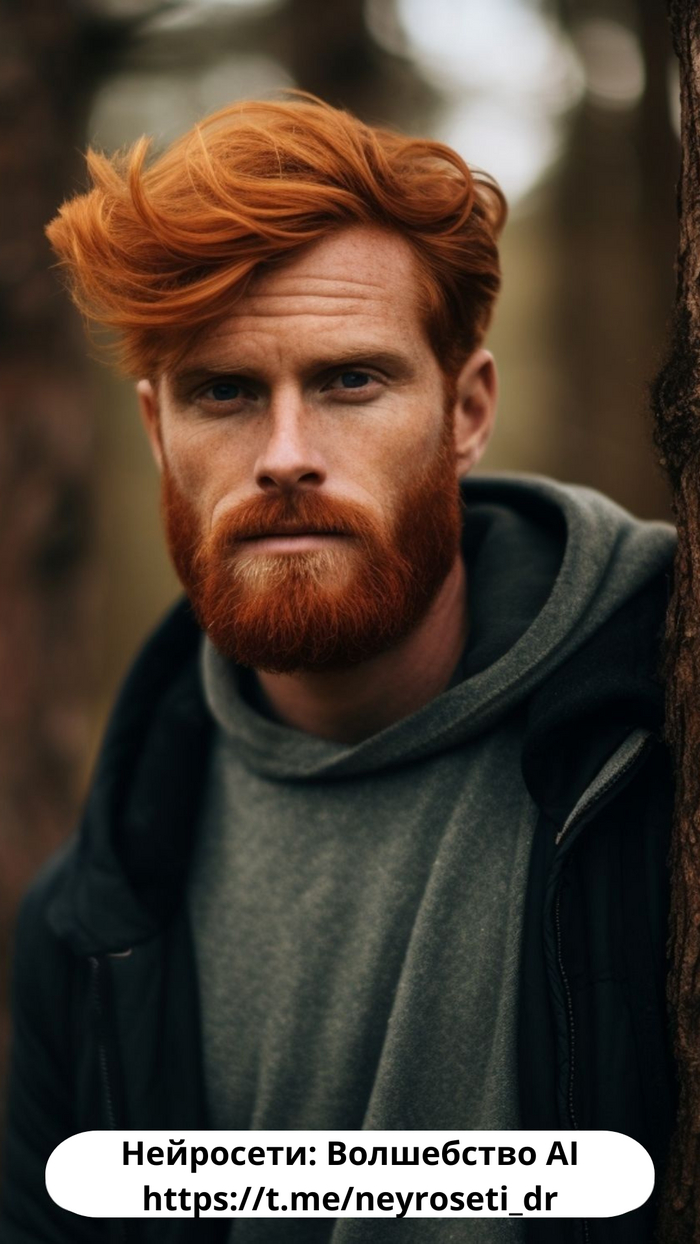 Closeup portrait photo of a gorgeous young man with red hair and beard, posing in a pine tree forest, autumn colors --ar 2:3