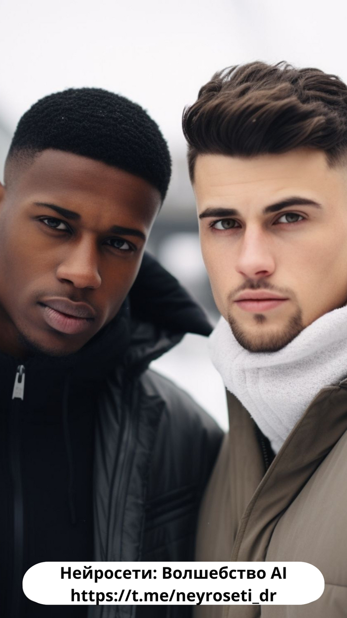 Closeup portrait photo of 2 fashionable young men with a fade haircut, posing on a bridge, snowy winter day, neutral colors --ar 2:3