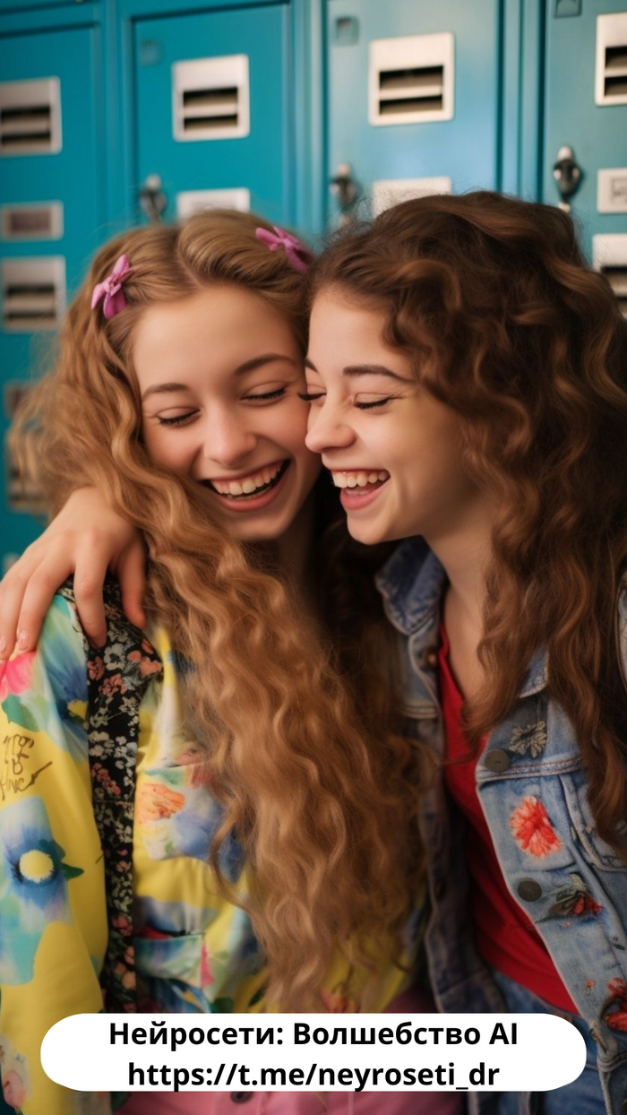 Closeup portrait photo of two giggling teenage girls, cute pattern fashion, posing in front of their school lockers, vibrant colors --ar 2:3