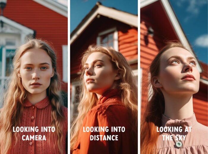 Определите направление взгляда модели с помощью таких ключевых слов, как looking down, looking at the camera, looking up at the sky и т.д.
