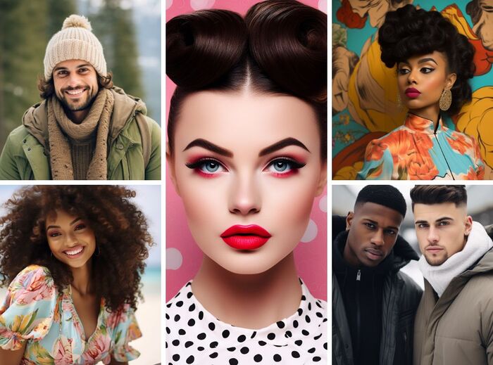 Определите прически моделей-женщин с помощью таких ключевых слов, как стрижка боб, вьющиеся волосы, пучок и т.д.
