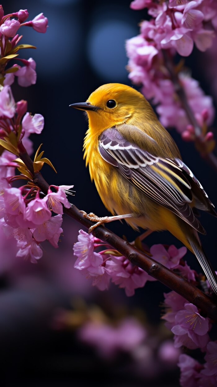 Bird Photography, Beautiful Yellow warbler in a purple flowering tree, Photorealistic, hyperrealism, Setophaga Petechia, stunning, Award-winning photography, Bokeh, Vivid, Beautiful lighting, HD, HDr, UHD --v 5.2 --s 500 --chaos 20 --ar 9:16