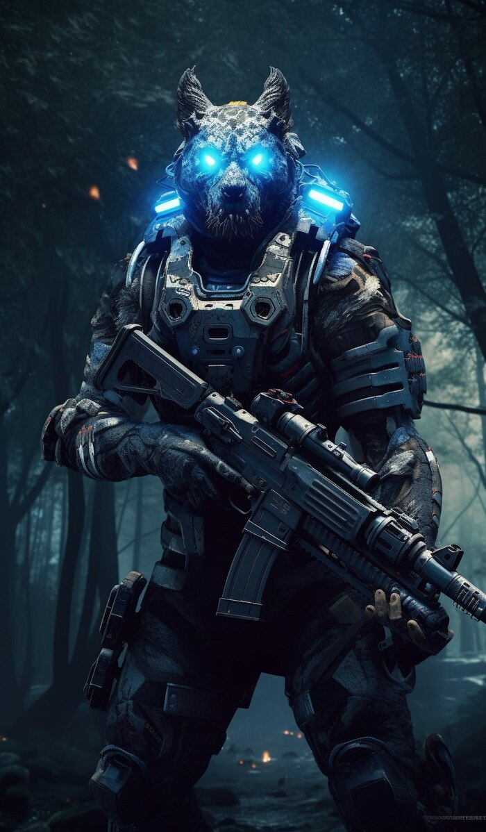 humanoid mastiff tiger hyena hybrid wearing tactical gear, blue black digital camo, tapetum lucidum Eyeshine, holding laser rifle, low fog, full moon, forest, cyberpunk overwatch influence, dangerous powerful, militaristic cinematography, natural light, 32k UHD, professional photography render, Hasselblad, ultra-sharp intricate fine details, subsurface scattering, HDRI, post processing --ar 7:12 --s 999 --q 5 --v 5.1 --style raw