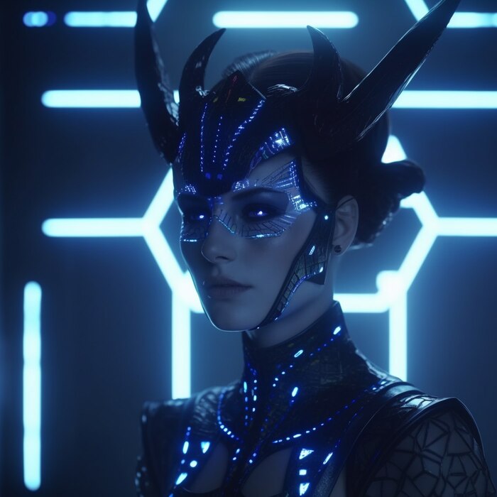 Stunningly beautiful brunette horned demon with rainbow hair in dark blue geometric armor with bright led lights, in a glass house, in the style of Alex Garland. Photorealistic. Reality. Focused. Clean sharp focus. No blur. Crystal clear. Hyperdetailed. High resolution. UHD. 8K. Ultra High Definition. High Quality.
