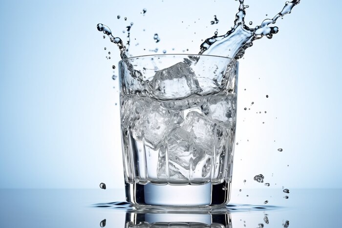 product photography, commercial photography, eye level, Hasselblad, white studio light, a glass of refreshing ice cold water, water splash effect, detailed --ar 3:2