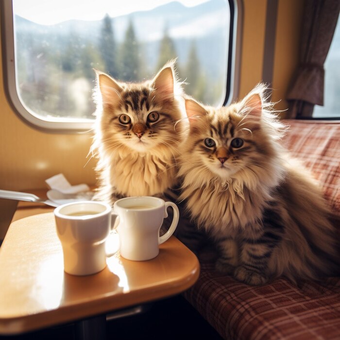 a loving couple of very cute fluffy kittens enjoying there breakfast inside the luxury Eastern Express train going through beautiful mountains railroad, photography 35 mm --q 2 --s 750 --style raw