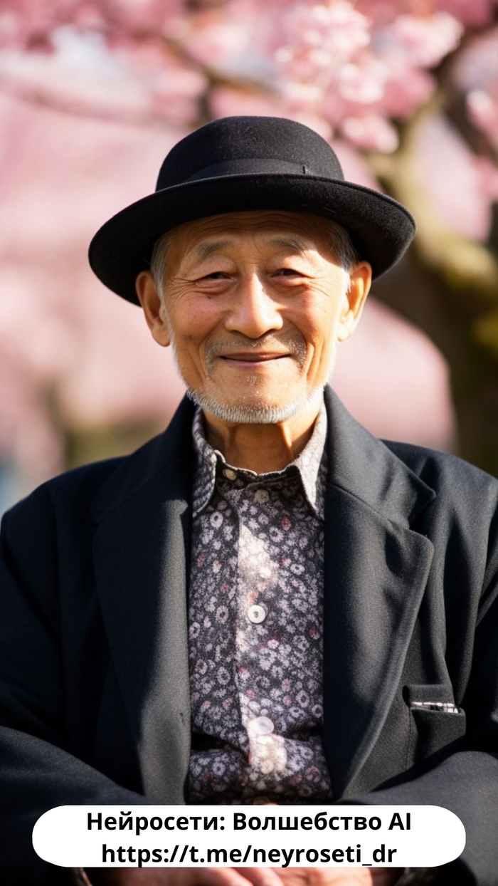 Closeup portrait photo of a happy elderly japanese man with a black hat, sitting on a bench in a park on a spring Day, cherry blossom, vibrant colors --ar 2:3