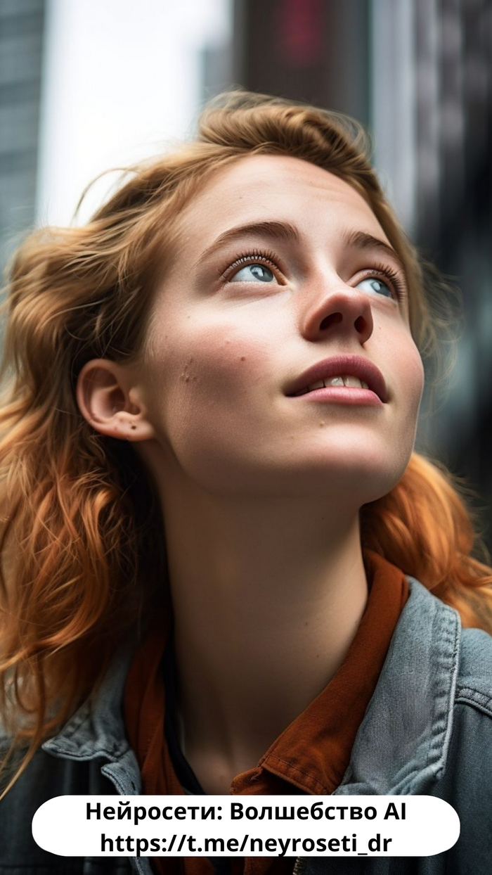 Closeup portrait photo of a young dutch woman, looking up at the sky, in downtown new york city --ar 2:3