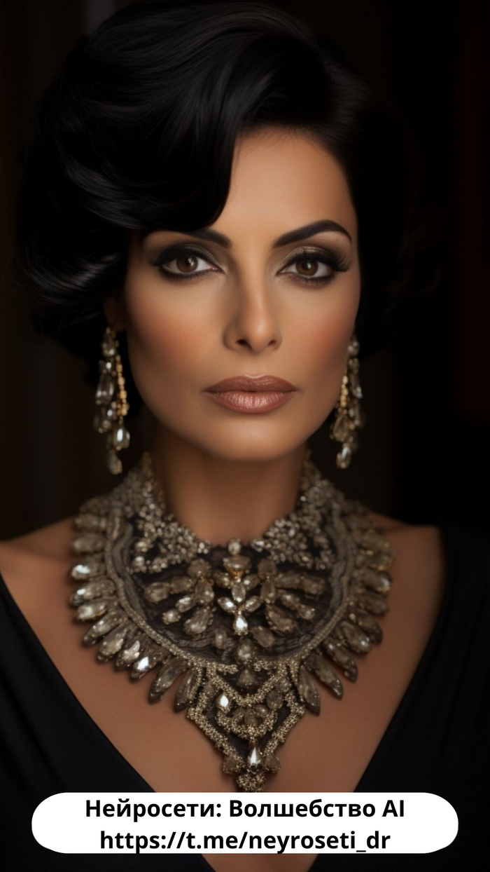 Определите украшения вашей модели и добавьте ключевые слова, такие как statement necklace, diamond earrings, silver tiara и т.д.