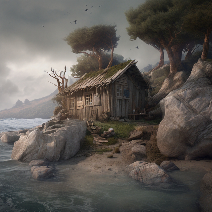 poor hut with sun battery by the sea like in fairy tail of grimm brothers with name the fisherman and his wife, surrounded by a wild landscape with trees and rocks. high tech low life. Old, gloomy atmosphere. Ultra Realistic. Cinematic. Highly detailed. Full photorealism.:: high tech low life::1 sun battery::0.5