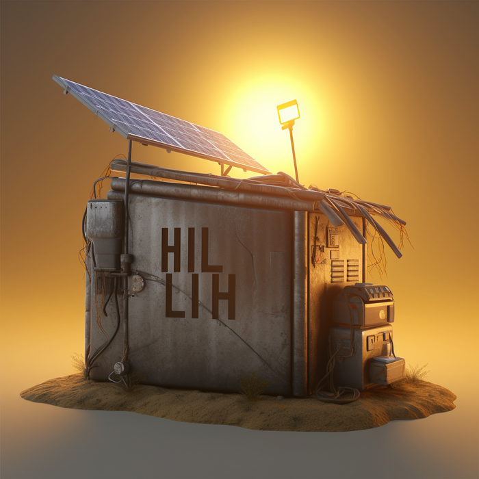 poor hut with sun battery by the sea, surrounded by a wild landscape with trees and rocks. Old, gloomy atmosphere. high tech low life. Ultra Realistic. Cinematic. Highly detailed. Full photorealism.