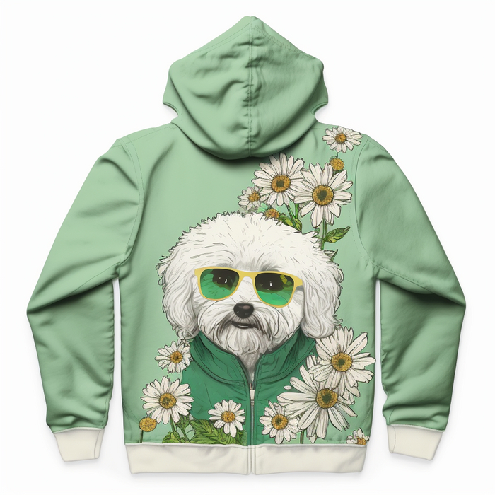 Промпт одинаковый: cute little white Havanese dog, dressed in a green and white down jacket, outside wearing sunglasses and daisy flowers