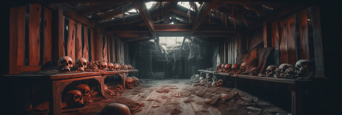 poor hut by the sea, surrounded by a wild landscape with trees and rocks. Old, gloomy atmosphere. In style high tech low life. Ultra Realistic. Cinematic. Highly detailed. Full photorealism.