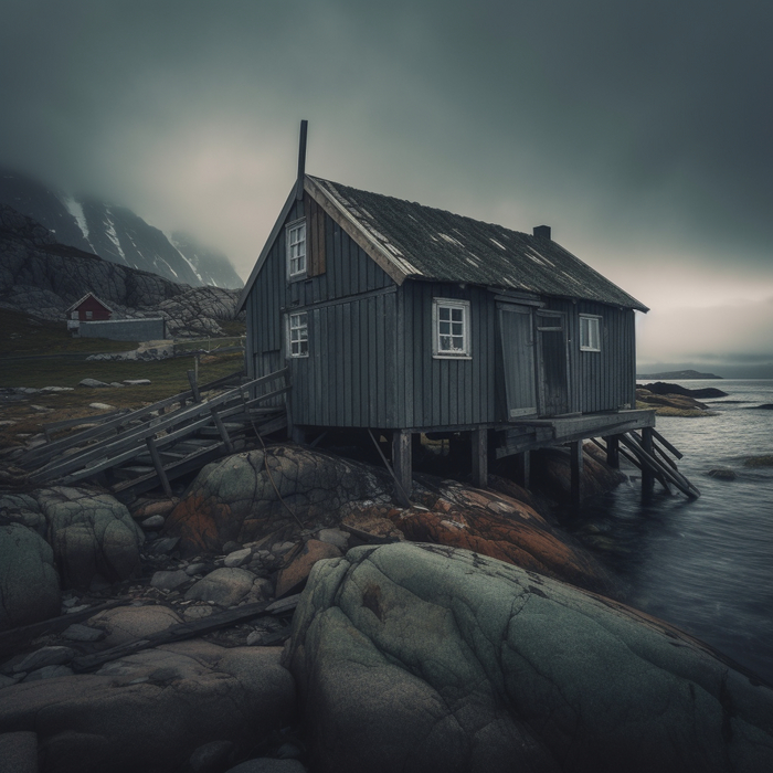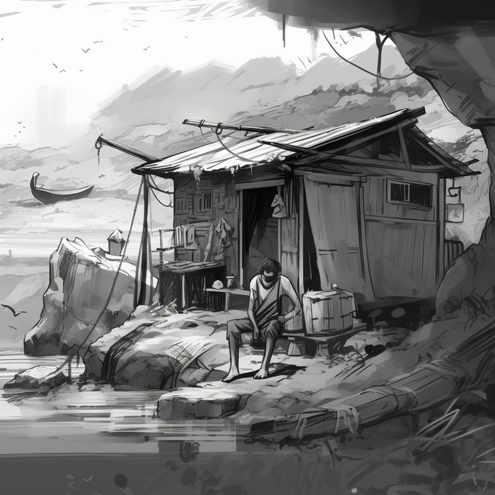 Fisherman lives in a poor hut by the sea, surrounded by a wild landscape with trees and rocks. Old, gloomy atmosphere, realistic::high tech low life