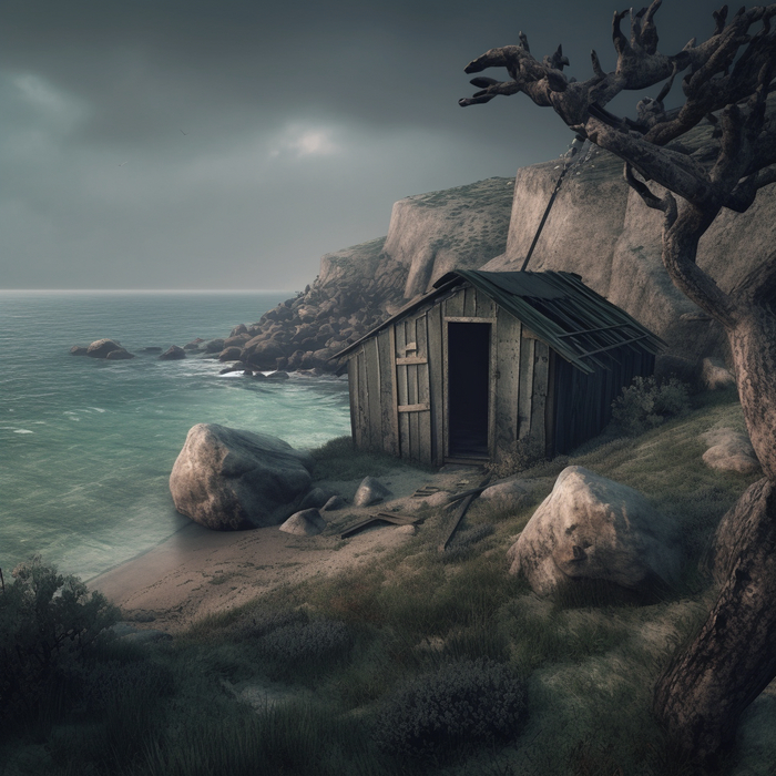 poor hut by the sea, surrounded by a wild landscape with trees and rocks. Old, gloomy atmosphere, realistic:: high tech low life, realistic:2