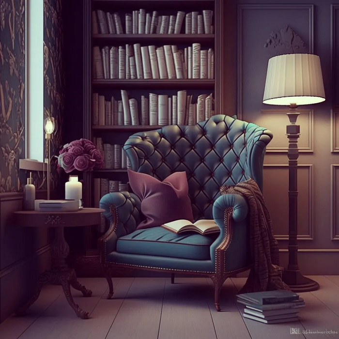 Представьте себе уютный уголок для чтения с удобным креслом, теплым пледом, подушками, мягким светом и большим шкафом с книгами.