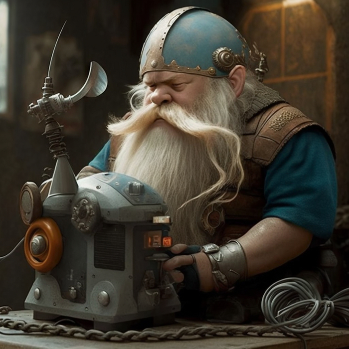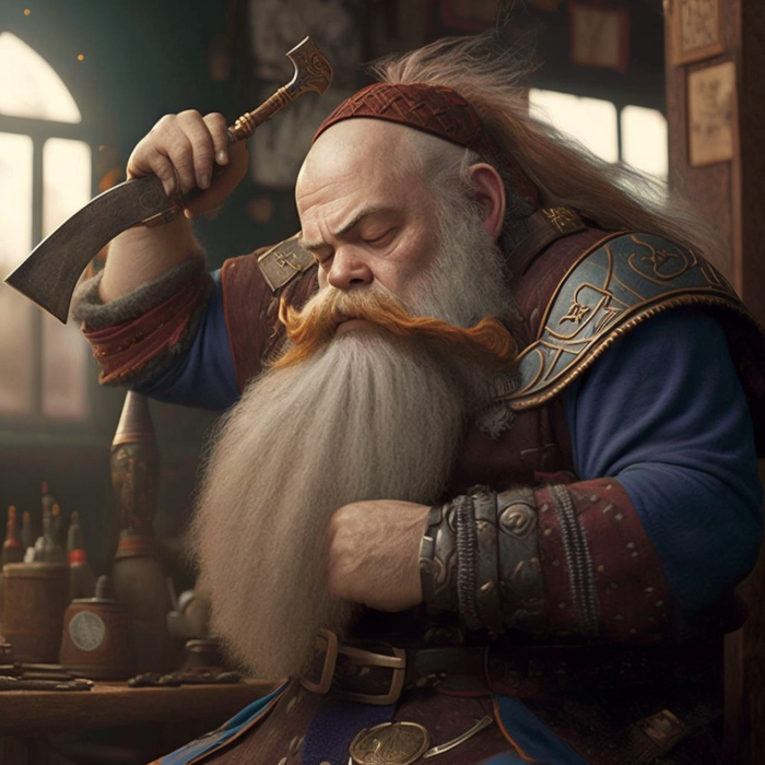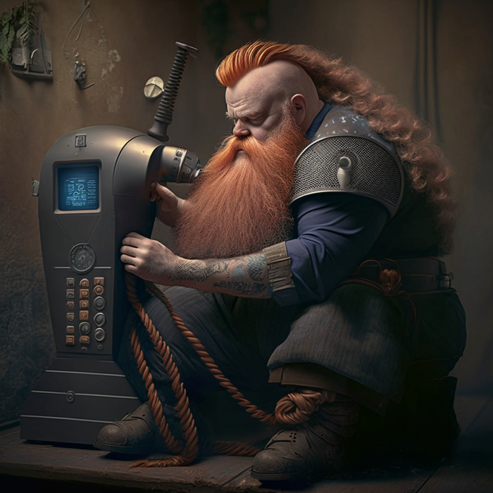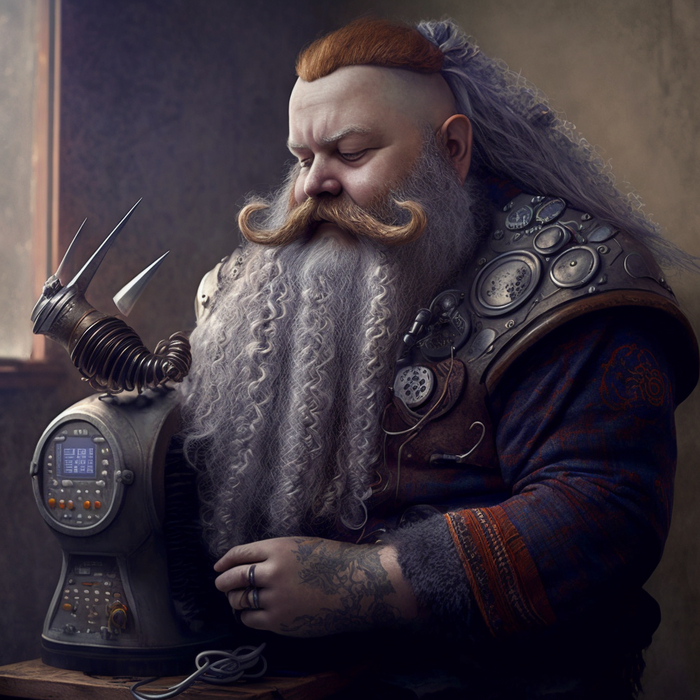 Промпт: a dwarf does beard styling with a dwarf beard styling machine / гном делает укладку бороды с помощью гномьей машинки для укладки бороды