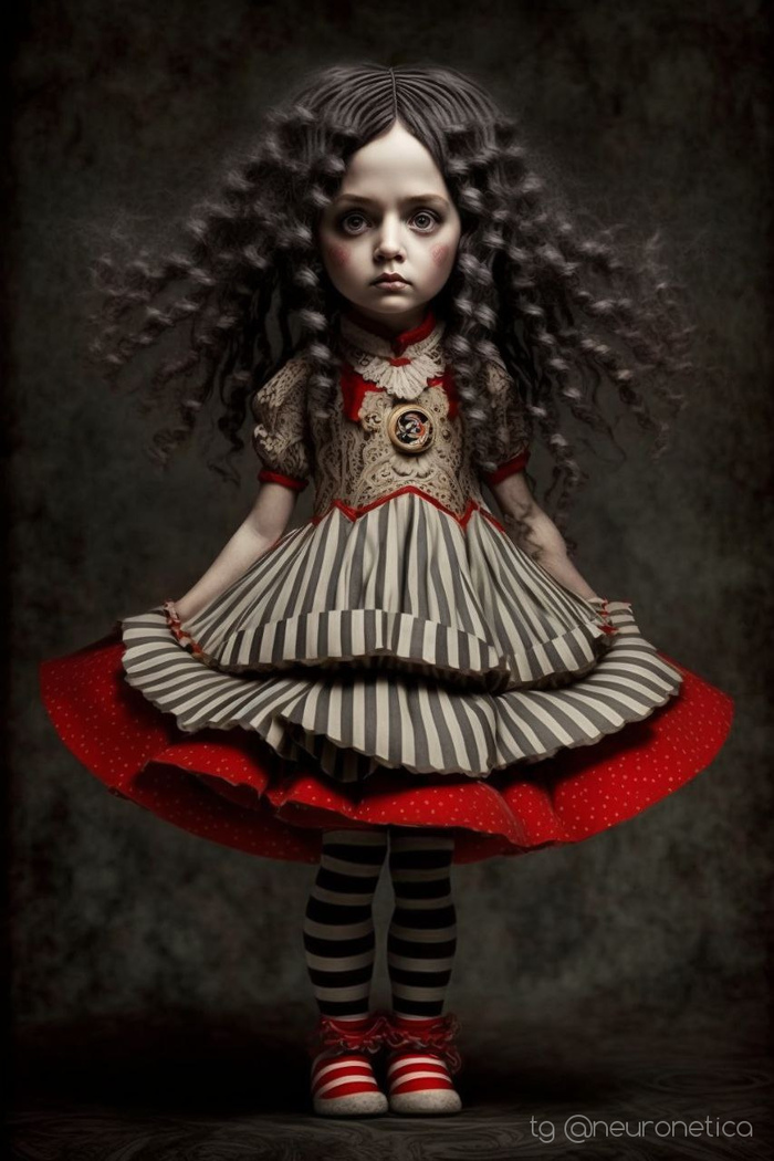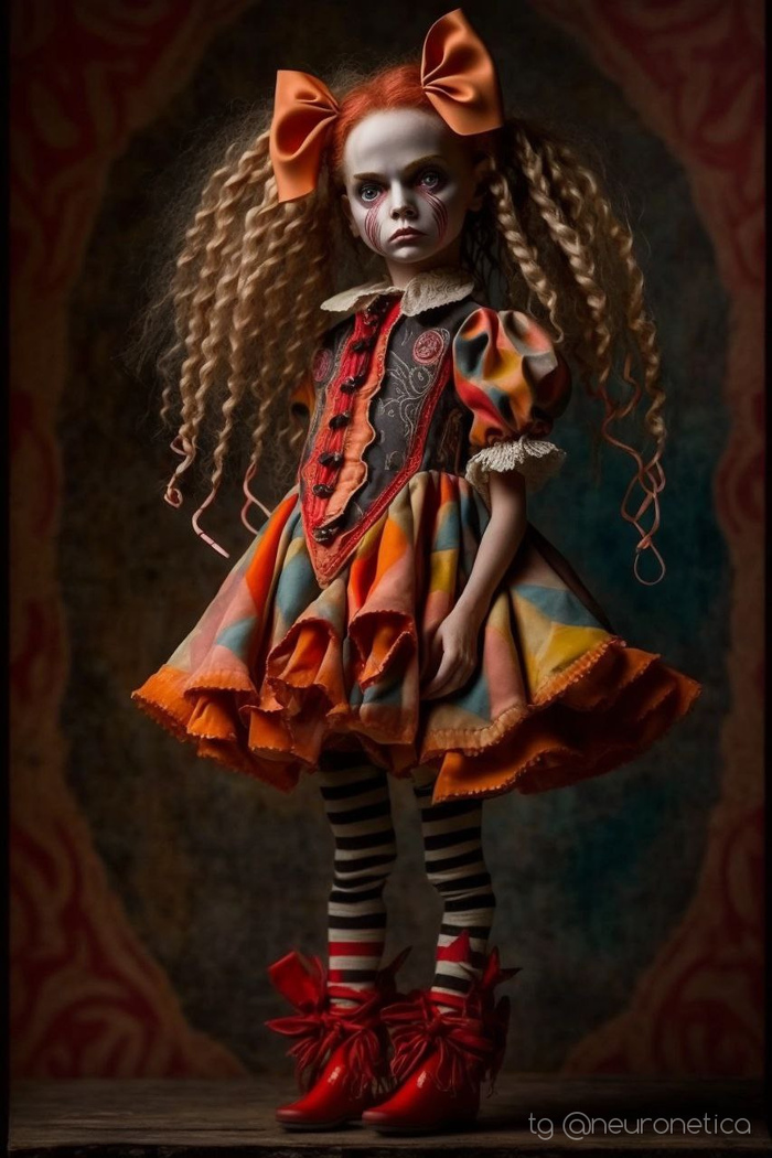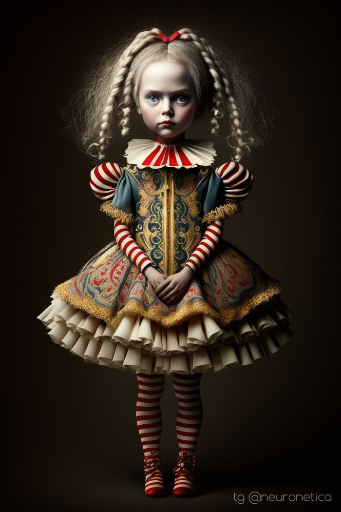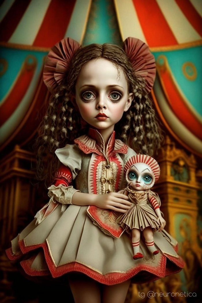Prompt: beautiful doll, full-length, beautiful circus clothes, perfect eyes, circus background, plasticine art, tim burton style ultra detailed --ar 2:3 --v 4