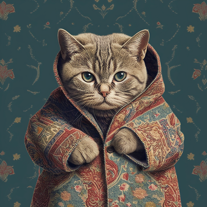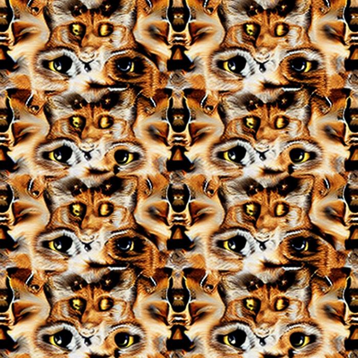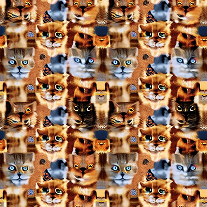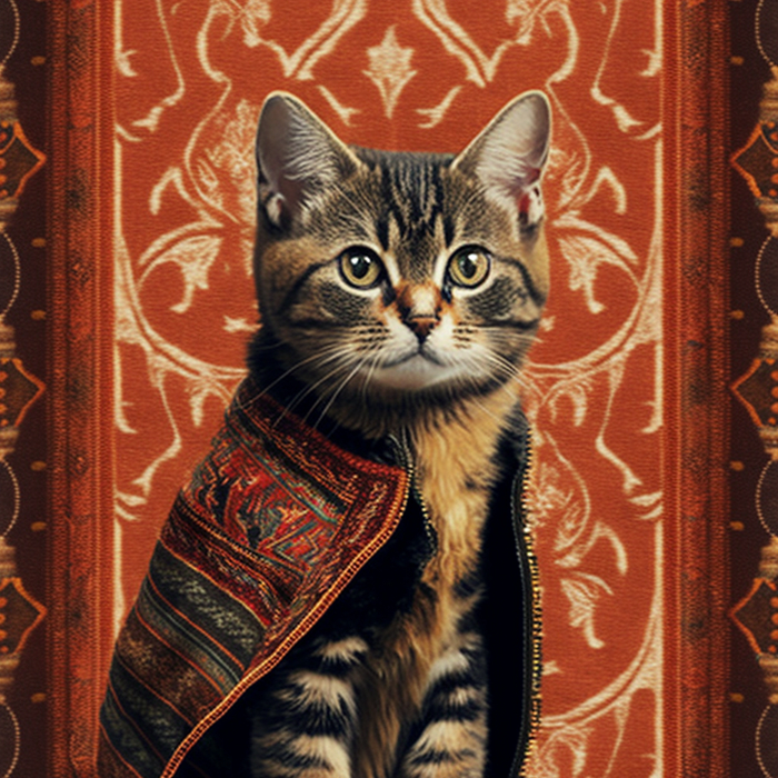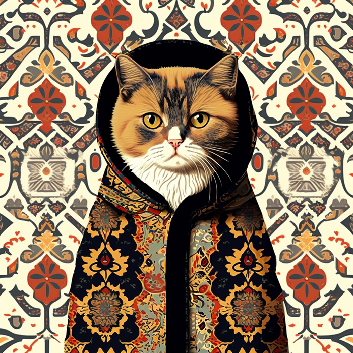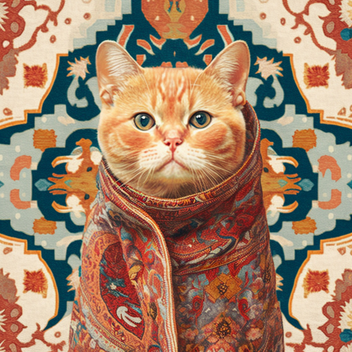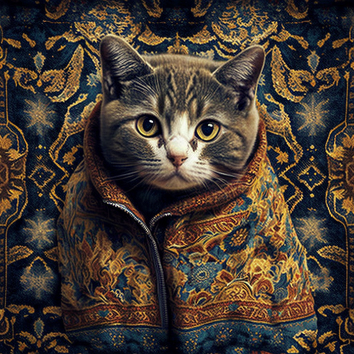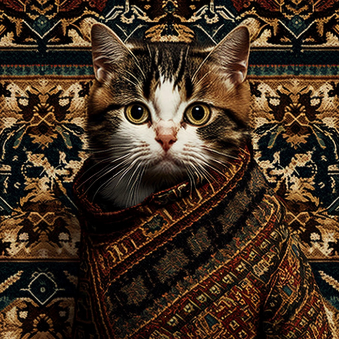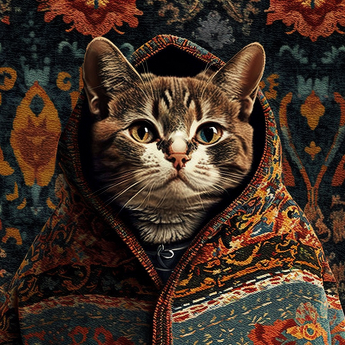 Долго пытался в Midjourney получить бесшовный паттерн, но бездушная сеть никак не хотела принимать концепцию преемственности объектов с разных сторон. Перебирая возможное слова для помпта пришел к коврам с узорами. Абстрактные ковры сеть создает легко, а вот осмысленные узоры сохраняя стилистику и текстуру делает уже не так охотно. И вот, в какой-то момент на свет экрана появились коты в коврах. И как устоять и не сделать серию котов в коврах на фоне ковров.