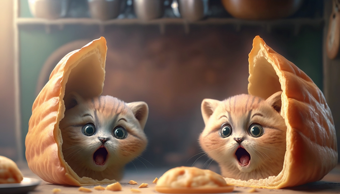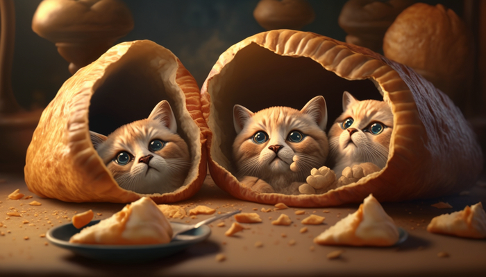 Поэтому просто представим, что маленькие котята понадкусывали бабушкины пирожки и залезли внутрь подремать. Ну, а бабушка застала их на месте пиршества, из-за чего они замяукали.