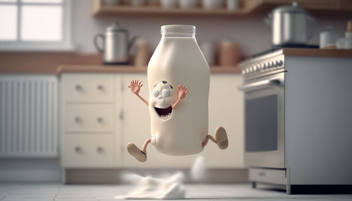 Если сделать картинку по фразеологизму дословной, то получается достаточно забавно, особенно если очеловечить предмет. Как, к примеру, это убегающее с кухни молоко, где-то оно убегает в ужасе, потому что узнало, что его скоро выпьют, а где-то радостно, наверное, спешит на свидание.