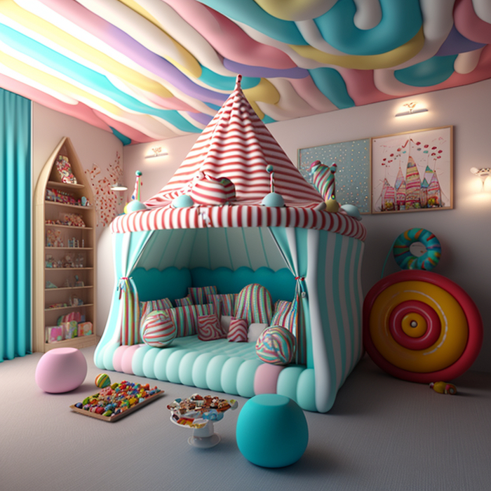 Продолжаю экспериментировать на платформе Midjourney. Решила создать варианты детских комнат в мультяшно-сказочном стиле, из которых ребёнок не захотел бы вылезать)