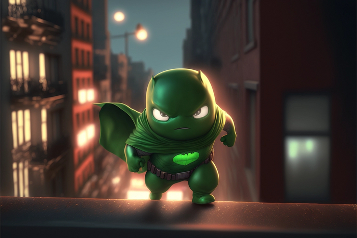 запрос: superhero pea pod man, run to meet between houses, city rooftops, spotlight, night, photorealism, high detail, unreal engine, medium angle, wide angle, high detail, 4k, --ar 3:2