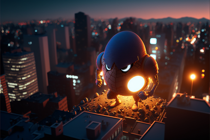 запрос: egg man, superhero landing, crashed, city rooftops, spotlight, night, photorealism, high detail, unreal engine, medium angle, wide angle, high detail, 4k, --ar 3:2