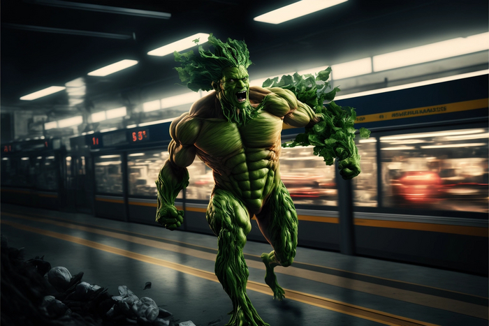 запрос: celery man, superhero landing, crashed, night, photorealism, high detail, unreal engine, medium angle, wide angle, high detail, 4k, --ar 3:2