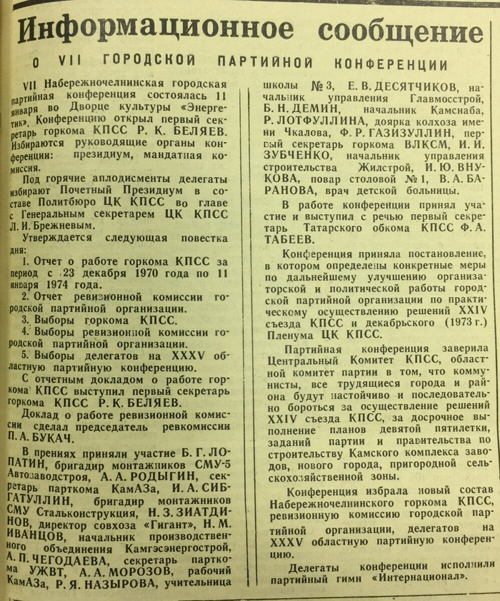 11 января 1974 года в ДК «Энергетик» в Набережных Челнах состоялась VII городская отчётно-выборная партийная конференция.