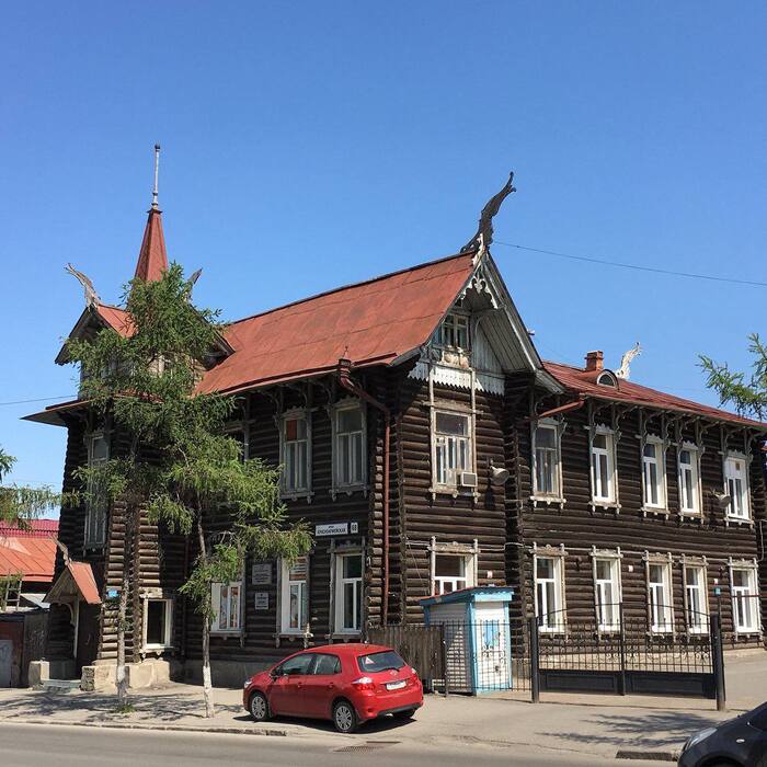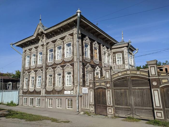 Томск — один из признанных центров деревянного зодчества в России. Здесь более 700 домов, которые можно разглядывать бесконечно. Вот «дом с шатром» — здание построено в 1902 году под руководством архитектора Станислава Хомича. Это был жилой дом купца Георгия Голованова.