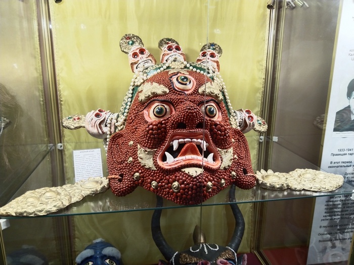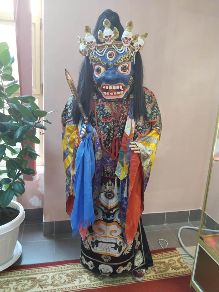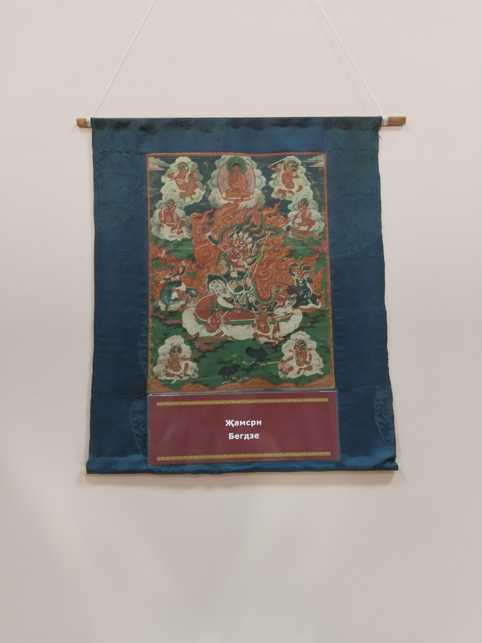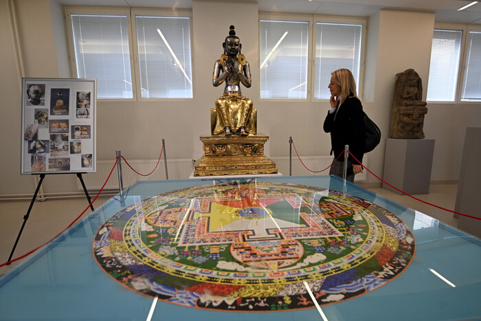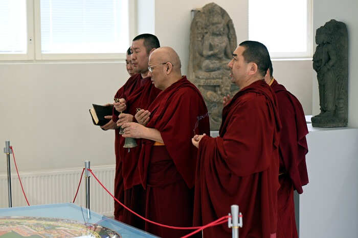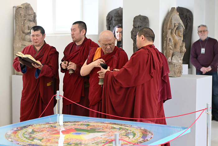 «Она относится к гневному божеству, которое называется Ваджрабхайрава – это гневное воплощение божества мудрости [Манджушри]. Мы очень почитаем это соединение микро- и макрокосмоса, и это, наверное, у нас единственная такая песчаная мандала, которая не разобрана, Дело в том, что буддизм учит: всё в мире — это пустота и иллюзия, и разрушение мандалы обычно как раз демонстрирует эту пустотность и эту иллюзорность мира. В данном случае мы сохраняем её как подарок», – добавила Елихина.